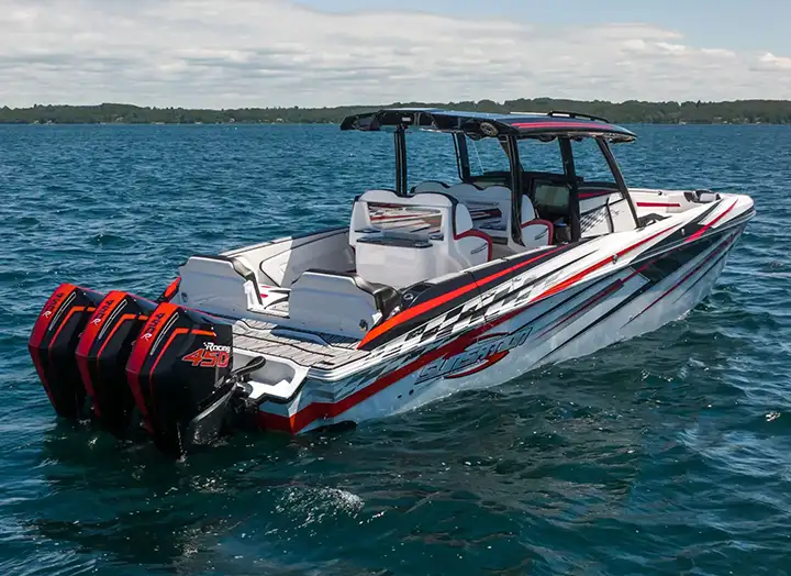 The 32CCX is designed and built in-house, showing our passion for style, performance, and innovation. Want to make it your own? Use our 3D boat builder to bring your vision to life and create a CCX that's truly one of a kind. Whether you're chasing thrills or kicking back and soaking it all in, the updated interior and thoughtful features make every moment on the water feel just right — smooth sailing through choppy waves or total relaxation in a quiet bay.